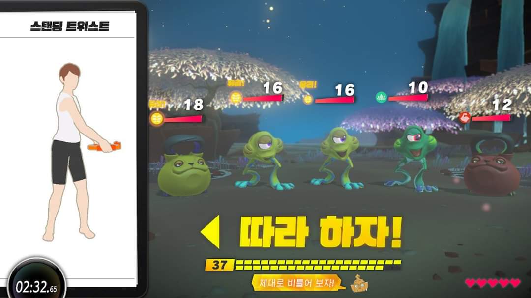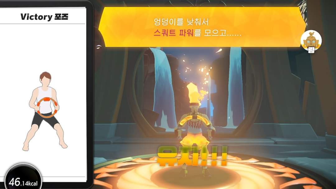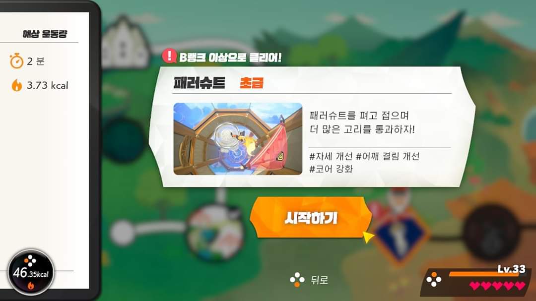 링 콘을 머리 위로 올리고 링을 당기면 패러슈트가 펴지면서 낙하 속도가 줄어들고, 허리를 앞뒤좌우로 스트레칭 하면서 낙하 방향을 결정하는 미니게임인데...