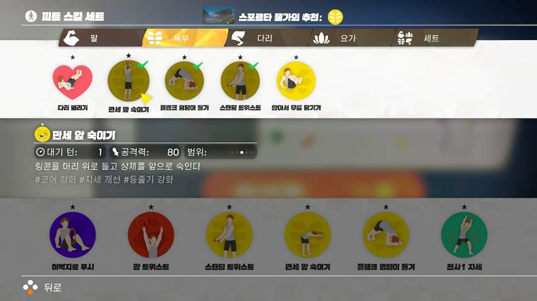 앉아서 무릎 당기기는 단일 공격에 공격력도 낮아서 뺐습니다.