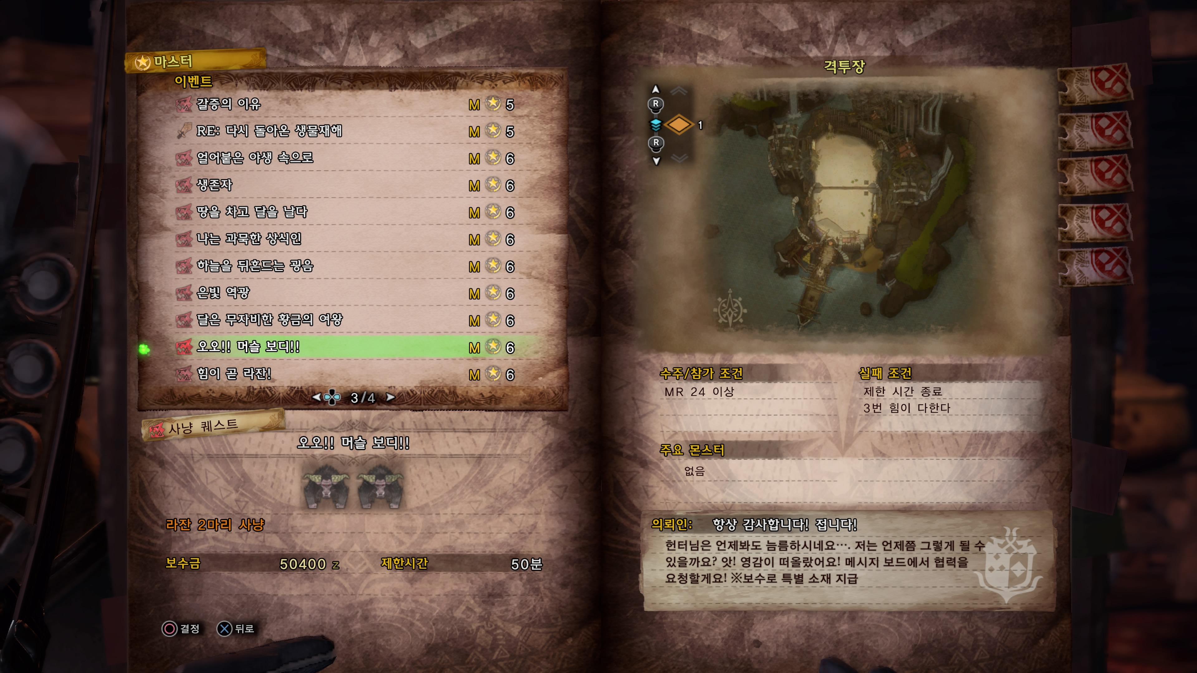 라잔 2마리를 연속으로 잡는 퀘스트인데 2마리가 동시에 나오는게 아니라 1마리가 먼저 나오고 5분뒤에 다른 1마리가 나오는 방식이라 5분이 되기전 울타리를 올리면 따로 싸울수 있습니다.